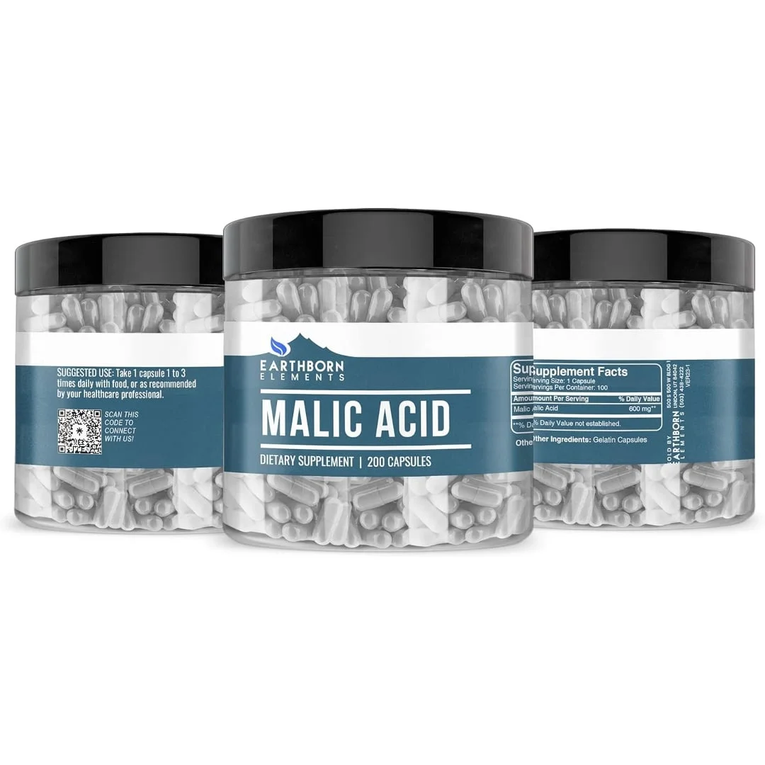 Earthborn Elements Ácido málico, 200 cápsulas, puro y sin diluir, sin aditivos
