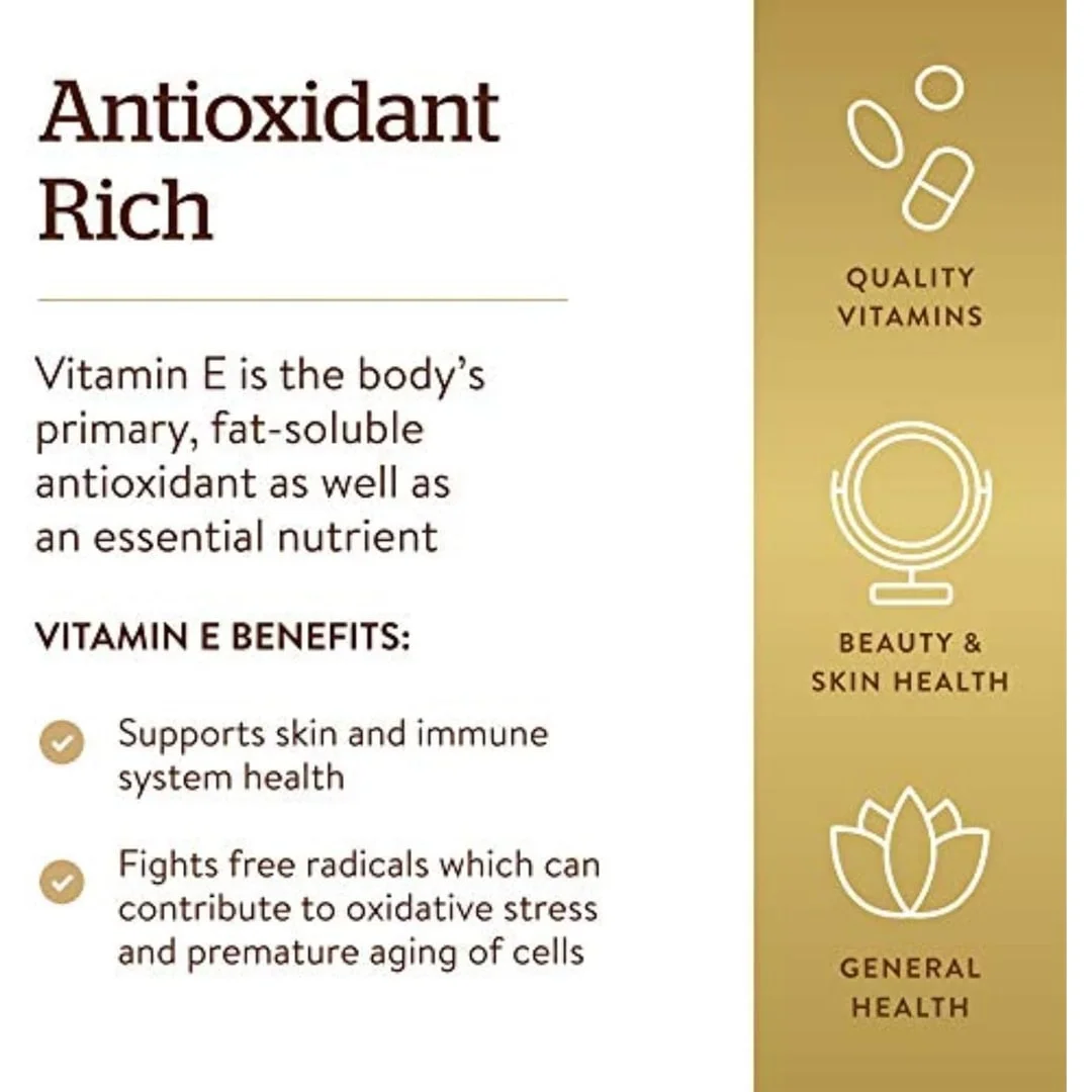 - ¿Por qué usar vitamina E?: la vitamina E es el antioxidante liposoluble primario del cuerpo y es también un nutriente esencial. Las cápsulas blandas a base de aceite promueven una absorción y asimilación óptima.