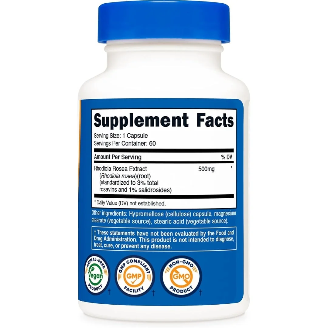 Nutricost Rhodiola Rosea 500 mg, 60 cápsulas vegetarianas – Suplemento de Rhodiola Rosea sin gluten y sin OMG