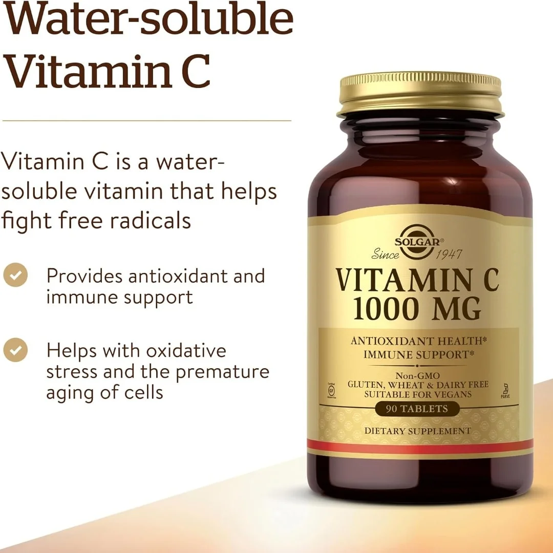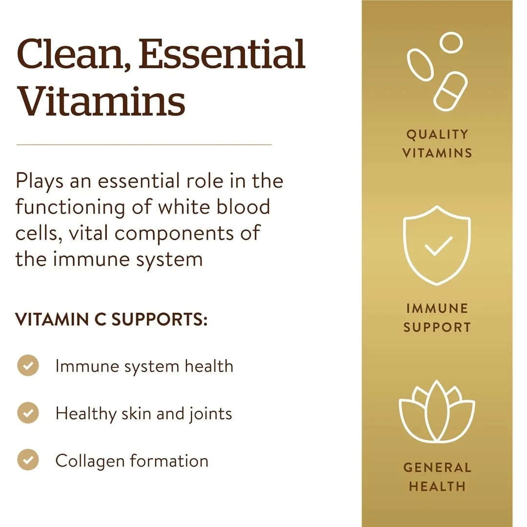 - Apoyo inmunológico; la vitamina C Solgar de 1000 mg ayuda a apoyar un sistema inmunológico saludable; también juega un papel esencial en el funcionamiento de los glóbulos blancos que son componentes vitales del sistema inmunológico