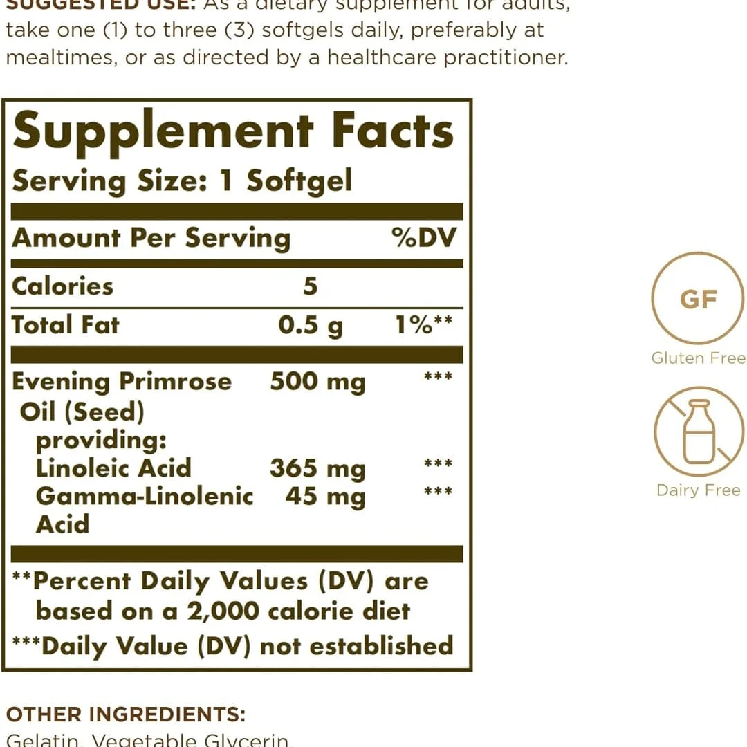 - Primrose de alta calidad; esta formulación de Solgar proporciona aceite de onagra de primera calidad, prensado en frío sin el uso de disolventes químicos; promueve el funcionamiento saludable de la piel, el sistema nervioso y el sistema cardiovascular