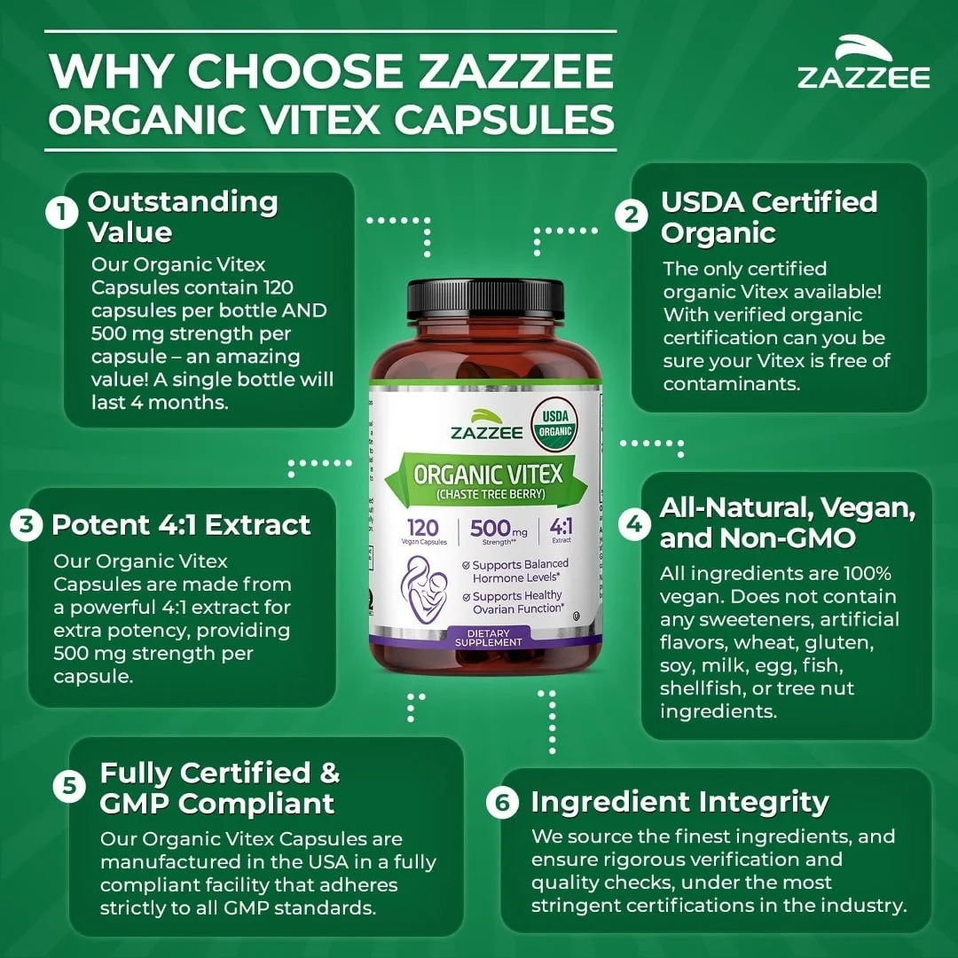 Zazzee USDA Organic Vitex, 500 mg de fuerza, 120 cápsulas veganas, suministro para 4 meses, Kosher, extracto 4X estandarizado y concentrado, bayas castitas orgánicas completas certificadas por USDA